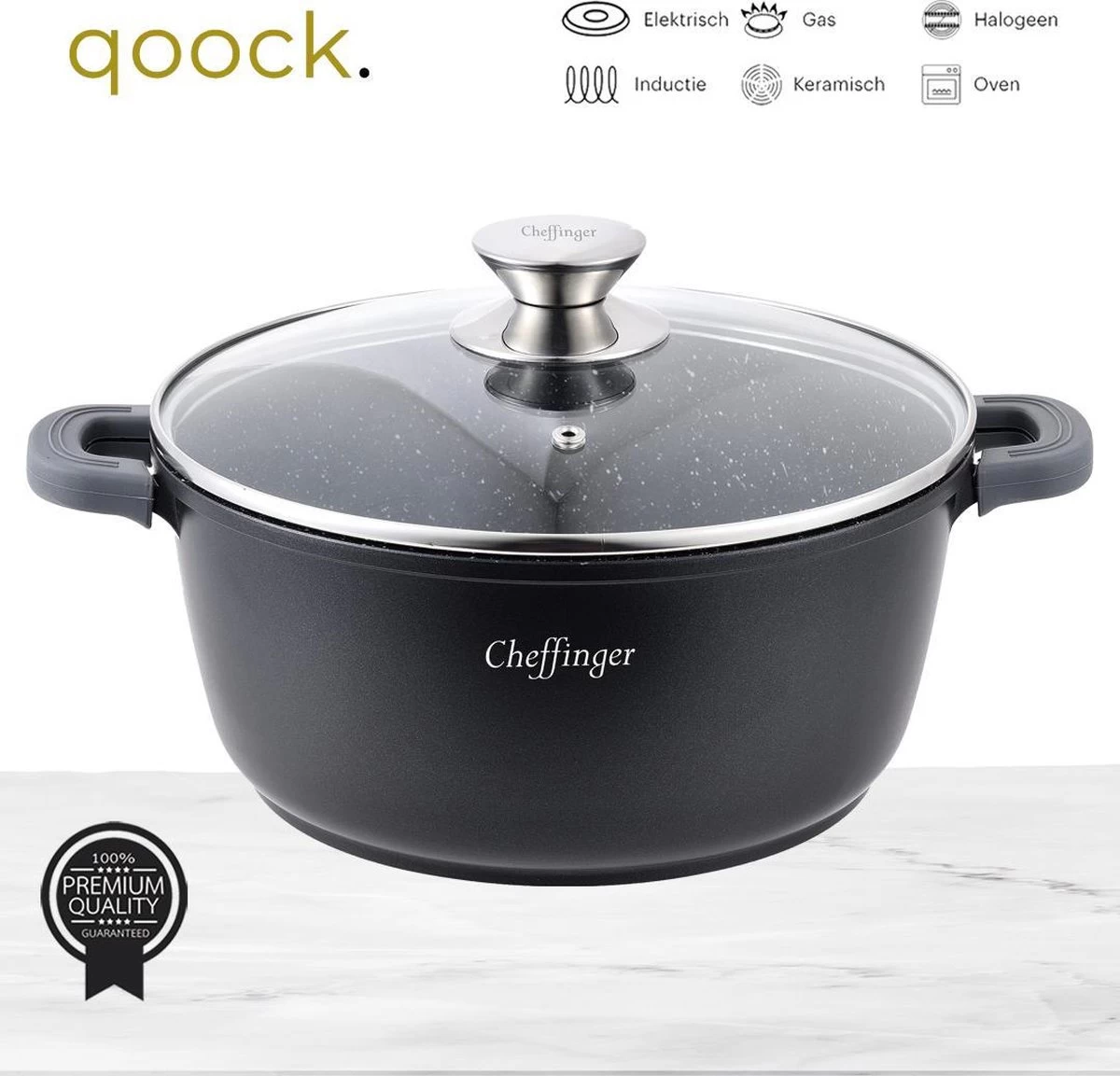 Deze Cheffinger Cooking braadpan heeft 3 lagen marmercoating, is gemaakt van gegoten aluminium en is geschikt voor alle vuren. Op de pan zitten afneembare handvaten, de knop is gemaakt van RVS en de deksel van gehard glas. De pan kan in de oven tot een temperatuur van 220 graden.