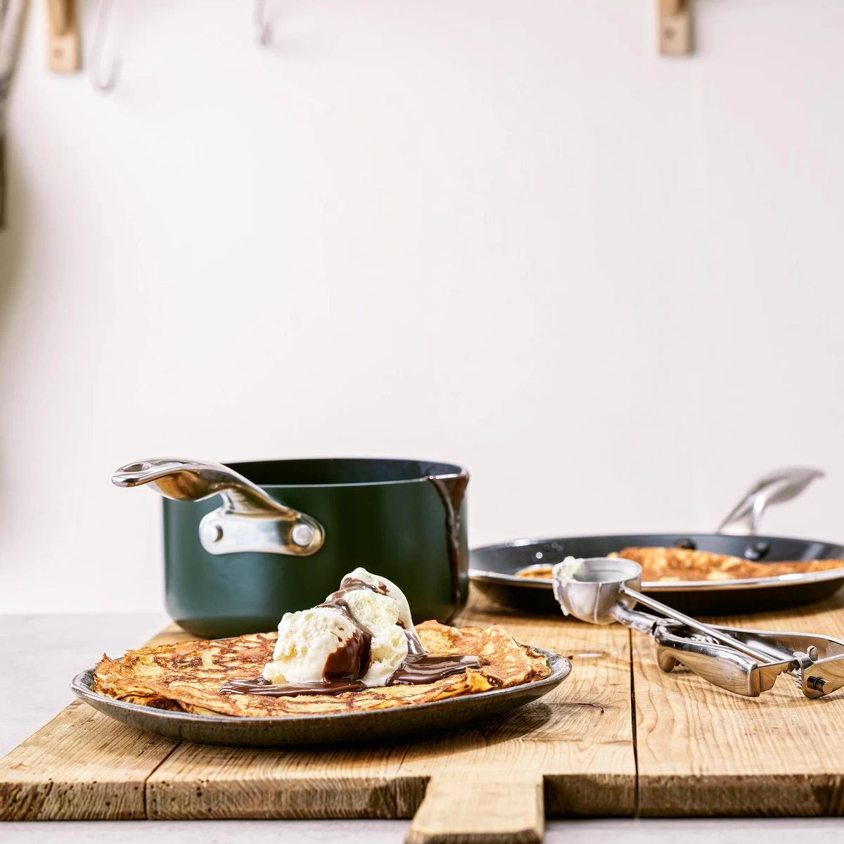 ❕ Schoonmaken en opruimen: Laat de pannen volledig afkoelen voor je het afwast. Anders is er kans op een thermische schok. Handwas wordt aanbevolen voor het behoud van de antikleefeigenschappen.
