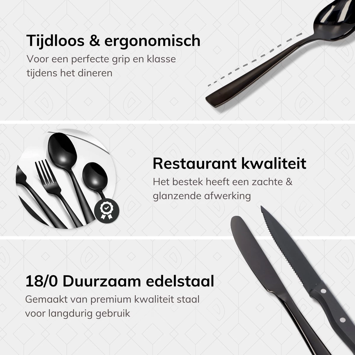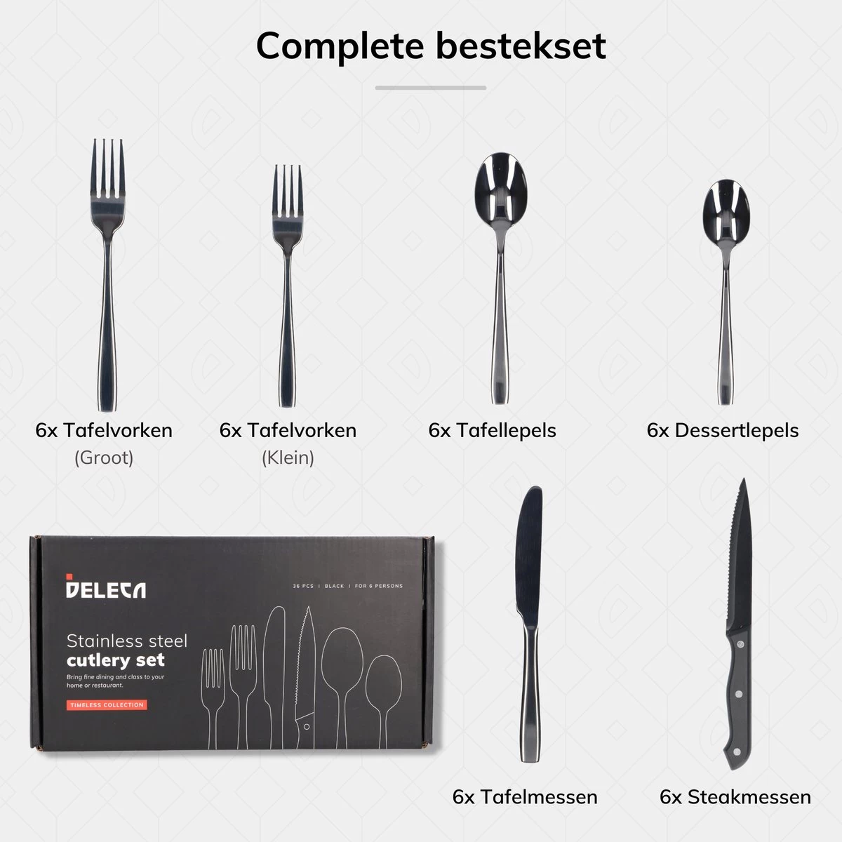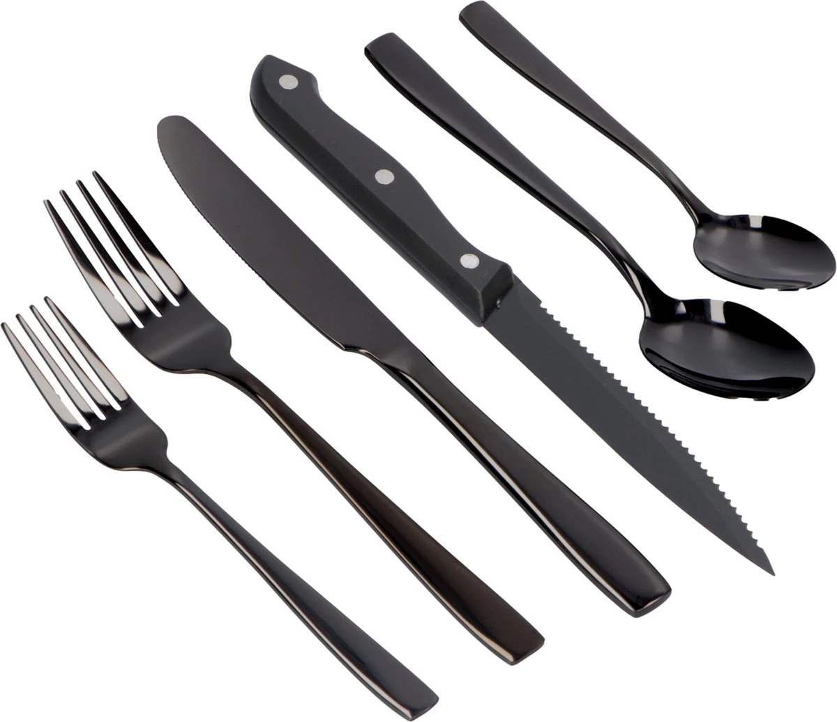 Deleca 6 Persoons Bestekset (36-delig) – Lepels, Messen, Vorken & Steakmessen – Vaatwasserbestendig – Zwart / RVS