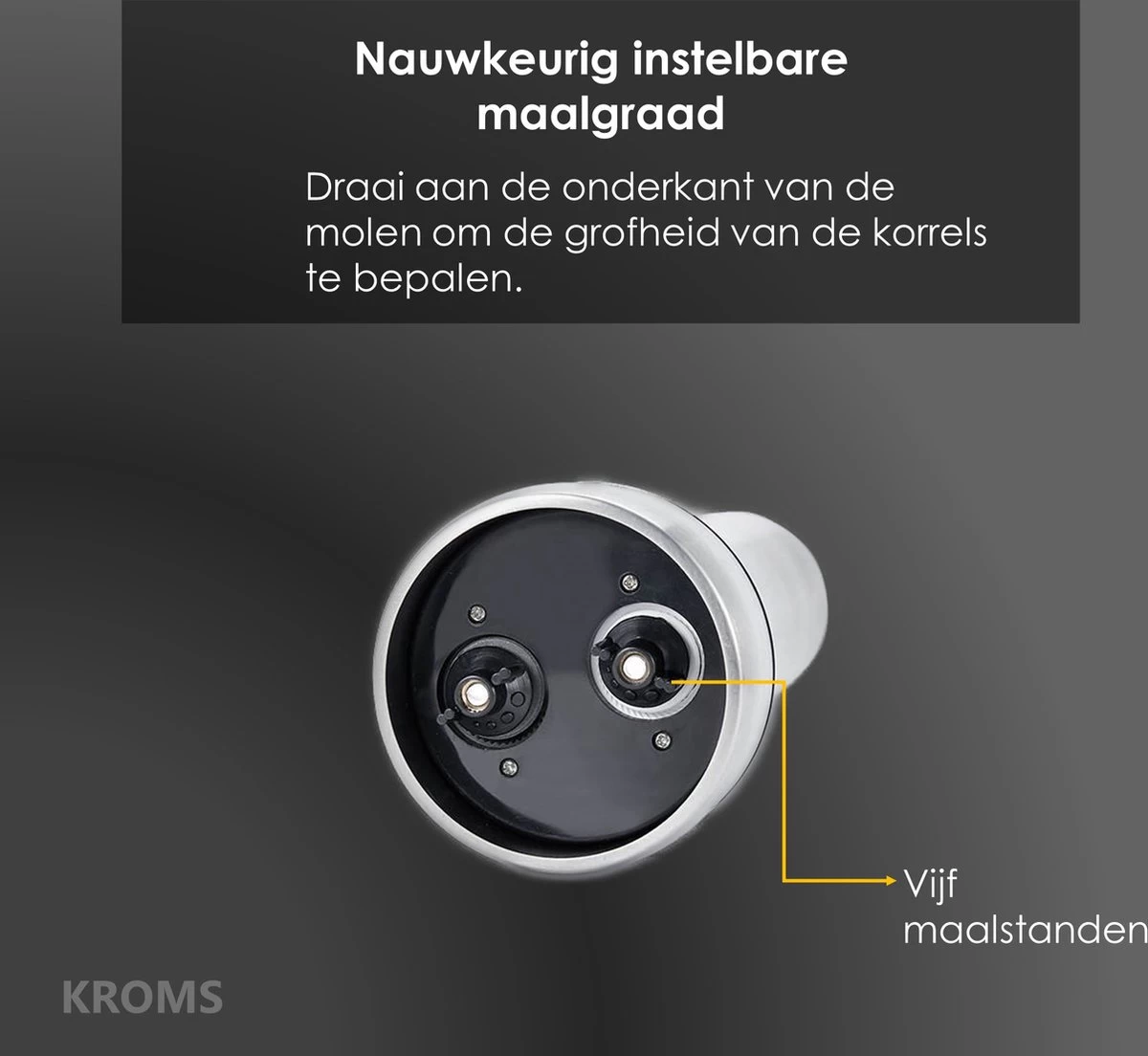 Vind je het draaien aan een peper- en zoutmolen tijdens het koken ook zo onhandig? Met deze KROMS peper- en zoutmolen kun je met één hand en één druk op de knop ieder gerecht op smaak brengen. Je hoeft ook niet meer te zoeken naar je potje zout of peper in de la, want mede danzijk het robuste design en duurzame RVS materiaal, staat de KROMS peper- en zoutmolen erg mooi in iedere keuken! De peper- en zoutkorrels kun je nu ook germakkelijk in één molen bewaren. Zo bespaar je ruimte in de keuken en heb je alles bij de hand met slechts één molen.